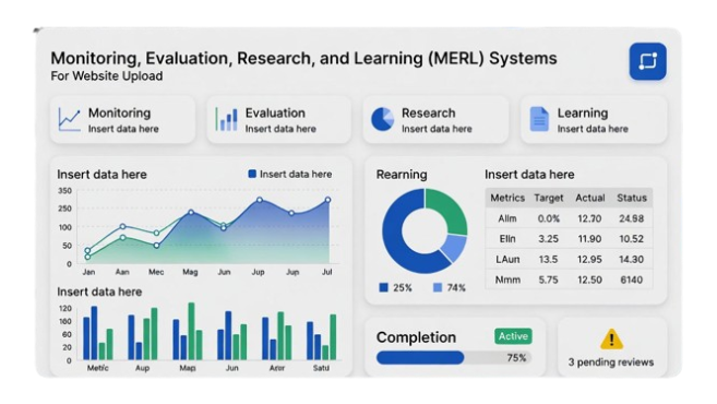 We design and implement complete Monitoring, Evaluation, Research, and Learning (MERL) systems for development programs and donor-funded projects. Our services include results framework development, indicator definition, Performance Monitoring Plans (PMPs), MEL data pipelines, real-time dashboards, and donor-compliant reporting systems. We support projects across health, education, nutrition, agriculture, climate adaptation, and social protection programs to ensure accurate performance tracking and impact measurement.